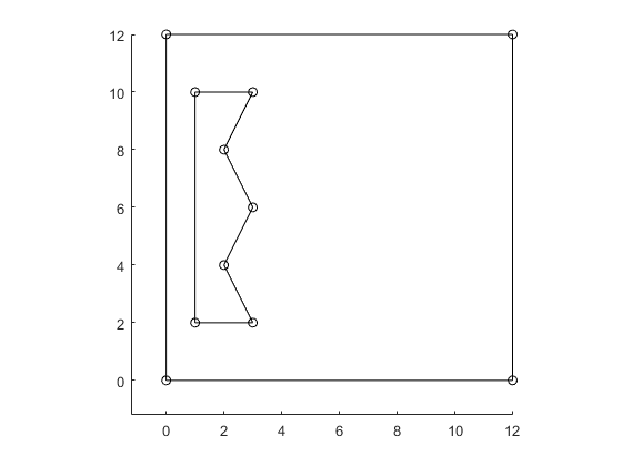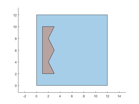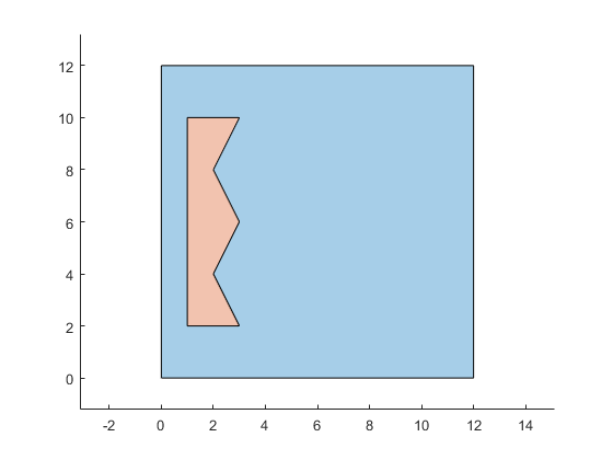 % square1 vertex1 = 12*[ 0 0; 1 0; 1 1; 0 1 ]; psSq1 = polyshape(vertex1); % square2 vertex2 = [ 1 2; 3 2; 2 4; 3 6; 2 8; 3 10; 1 10; 1 2]; psSq2 = polyshape(vertex2); figure hold on; axis equal plot(psSq1); plot(psSq2); hold off